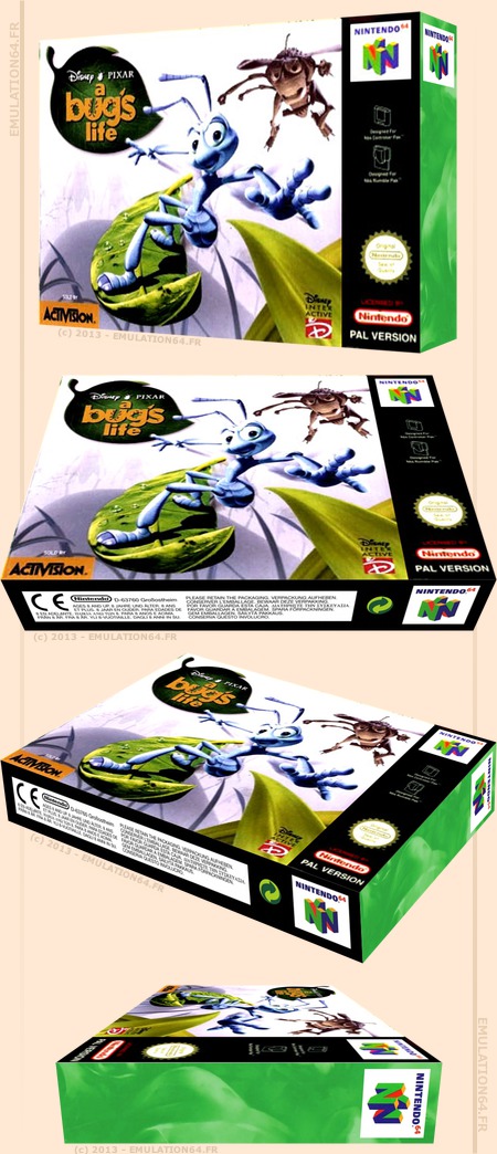 Bug's Life, A : Informations : Plate-forme : Nintendo 64 (N64) Etat du jeu : Disponible Date de sortie française : 4eme trimestre 1999 26 mai 1999 (USA) Genre : Plates-formes Jouable uniquement en solo Développeur : Traveller's Tales Editeur : Activision Jeu également connu sous le Nom : 1001 Pattes |